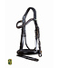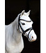 Hoofdstel in buffelleder met gecombineerde neusriem met lak afwerking. De kopriem met anatomische vormgeving is in super zacht leder en heeft een dikke vulling wat de kopriem comfortabel maakt voor het paard. De frontriem is afgewerkt met ingelegde kristallen in zachtroze en grijs.