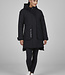De jas heeft een rechte pasvorm en is aan de achterkant iets langer gesneden voor extra bedekking. Met een knielange lengte (ruglengte ca. 98 cm bij maat 38) en een vaste capuchon ben je volledig beschermd tegen wind en regen.